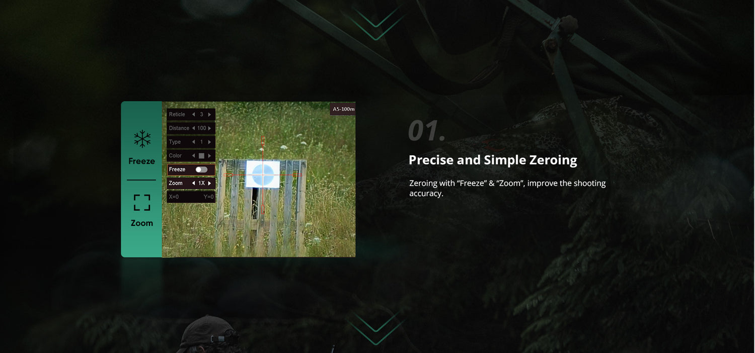 Rolling the jog dial up and down controls your digital magnification (3.5x – 14x). Press and hold this in to access the menu which includes a simplified zeroing system with the inclusion of freeze-frame and magnification. Advanced software provides up to 5 zeroing profiles allowing you to use the Alpex on multiple Rifles.